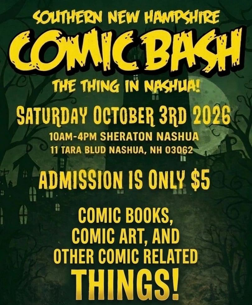 Our 2026 comic book show will, once again, be held in the BOOtiful Sheraton Nashua in Nashua, NH, from 10am-4pm on Saturday, October 3rd! We’ll be hosting a slew of wicked awesome vendors, creative folk, and you’re guaranteed to find wall to wall comic book related goodness within the doors of ghastly grand ballroom!